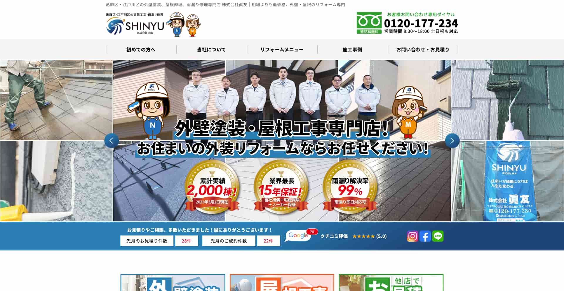 ãæåºå¡è£ ãã¯ãå€å£å¡è£ ã»å±æ ¹å¡è£ ã»é²æ°Ž/ã·ãŒãªã³ã°å·¥äºãäžè²«ããŠæãããå°å å¯çã®å¡è£ å°éäŒç€Ÿã§ããèŠç©ããããå®äºãŸã§äžè«ãã䜿ããèªç€Ÿè·äººã責任察å¿ãã匷åŒãªå¶æ¥ãäžéæãªè¿œå è²»çšãæããææäŒèšã»èª 宿œå·¥ã培åºããŠããŸããè€æ°åå¡ããªã©å·¥çšç®¡çã確å®ã«è¡ããäžå°åŠçããäžå¡ããŸã§äžå¯§ã«é²ããããšã§é«å質ãªä»äžããã远æ±ããŸãã
