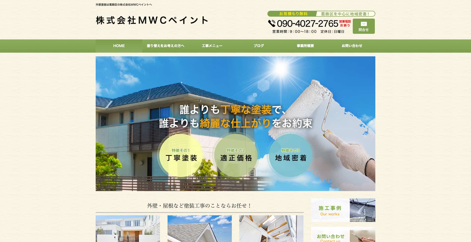 æ±äº¬éœè食åºã«æ ç¹ãçœ®ãæ ªåŒäŒç€ŸMWCãã€ã³ã ã¯ããå®å¿ã»äžå¯§ã»é©æ£äŸ¡æ Œããã¢ãããŒã«ãèªç€Ÿäžè²«æœå·¥ã§å€å£ã»å±æ ¹ã»å è£ ãªã©ã®å¡è£ å·¥äºãæãããå¡è£ å°éåºã§ããå€å£å¡è£ ã§ã¯ã建ç©ã®çŸèгãèãããã ãã§ãªããäžå°åŠçããäžå¯§ã«æéããããŠæœå·¥ããããšã§ã塿ã®å®çæ§ãèä¹ æ§ã«ããã ãã£ãŠããŸãã