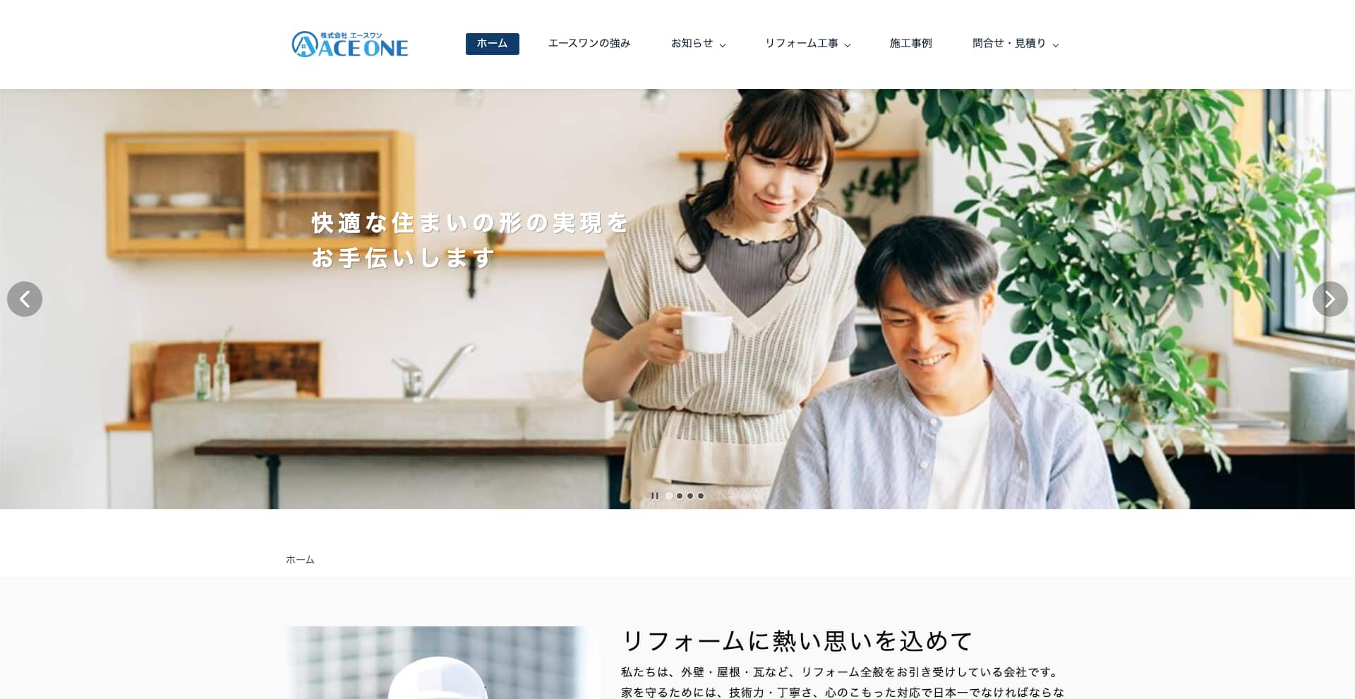 æ ªåŒäŒç€ŸACE ONE ã¯ããå®¶ãå®ããããšãçæ¯ã«èããå€å£ã»å±æ ¹ã»çŠãäžå¿ãšããäœå® ãªãã©ãŒã ã«ç±ãæãã蟌ããŠåãçµãå°éäŒç€Ÿã§ããå€å£ã®ç¶æ ãèŠæ¥µããå¡è£ ãå¯èœãã©ããããŸãã©ã®å·¥æ³ãé©åããçŽ æã»ç°å¢ã»å£åç¶æ ããµãŸããŠå€æãè·äººä»»ãã§ã¯ãªããåä»ããçŸå Žç®¡çãæœå·¥å®äºãŸã§å°ä»»ã®æ åœè ã責任ãæã£ãŠå¯Ÿå¿ããäœå¶ãæŽããŠãããããå®å¿ããŠä»»ããããšãã§ããŸãã